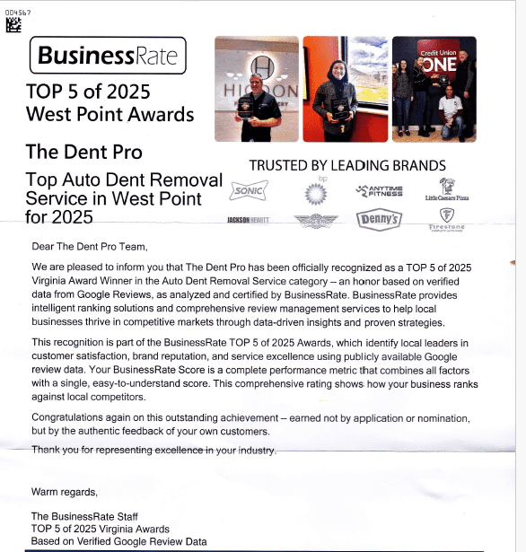 As The Dent Pro, I bring over 20 years of expertise to mobile paintless dent repair. Serving Hampton, Newport News, Yorktown, Williamsburg, Gloucester, Mathews, Toano, and the Richmond area, I specialize in restoring your vehicle’s appearance without compromising its factory finish. Guided by integrity, honesty, reliability, and kindness, I operate The Dent Pro with a strong commitment to quality, transparency, and total customer satisfaction. You can expect professional, hassle-free service backed by a satisfaction guarantee.